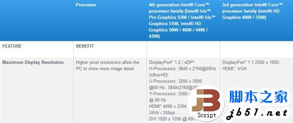 而且值得注意的是,移动版的U系列产品最高只能输出3840*2160@30Hz的分辨率规格,Y系列在60Hz刷新率下只能输出2560*1600分辨率,只有H系列也就是配置了Iris系列核心显卡的产品才能输出3840*2160@60Hz的分辨率规格。至于上一代Ivy Bridge则最高只能输出2560*1600,全部不支持输出4K分辨率。