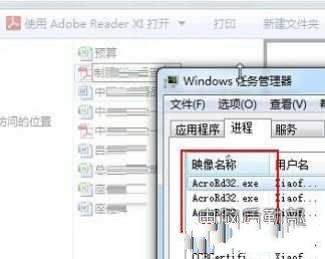 此时我们打开任务管理器的“进程”可以发现有很多的“AcroRd32.exe”进程,我们结束这些进程后PDF文件又可以操作了,但关闭后问题又和开始时一样,最终的解决办法只有重新装回Adobe Reader 10.0,即Adobe Reader X。