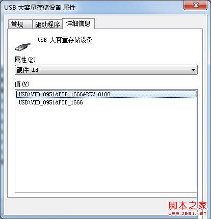 3、在“设备管理器”中展开“通用串行总线控制器”,找到“USB大容量存储设备”,在它的“属性”窗口中点击“详细信息”标签,复制出它的硬件ID也保存一下。如下图所示: