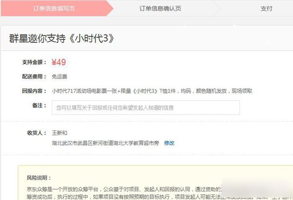第五步:了解完详细资料后,即可在面页右边的支持金额列表点击进入《支持》支持金额一般都设定有几个档位,不同档位的回报方式有所不同选择支持金额后就在订单面页填写《收货地址》点击下一步提交