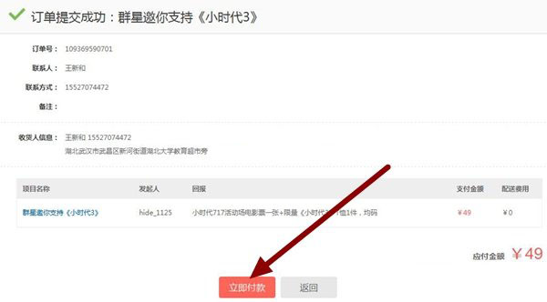 PS:无私支持的金额最少为1元起步。一旦支持付款成功是不可取消的哦!付款成功后返回点击《我的订单》即可查看支持项目的详细交易。如果众筹项目失败时你支持的金额会退还到你的网银钱包中。