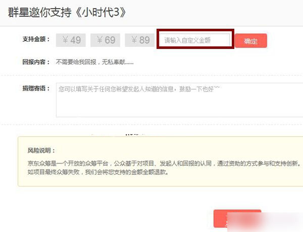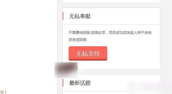 注意:上面说的是有偿回报的支持项目;那么同时你也可以无私支持你看好的项目。无私支持是没有回报的哦!在面页右边往下拉点击进入《无私支持》进入无私支持后输入《支持金额》再点击《确定》最后同样提交订单付款即可。