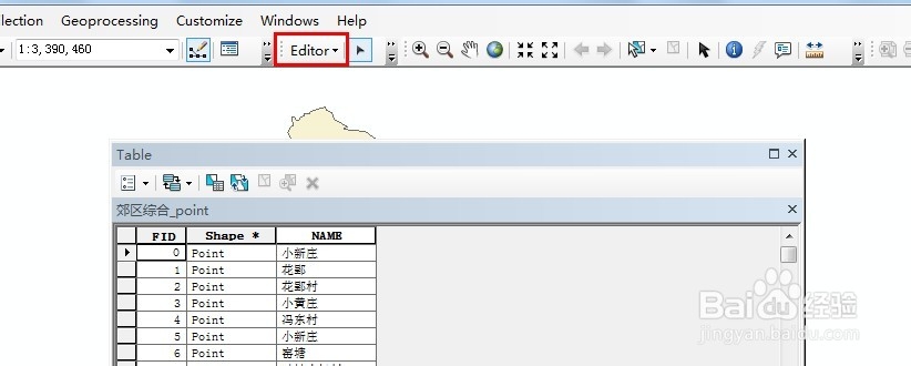 2、选择"Editor"->"start editing"进行对属性表编辑操作;