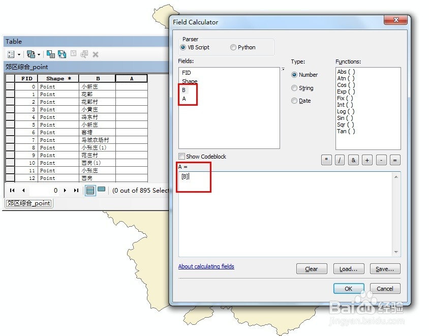 4、在"Attributes of (属性表名)" 窗口中,选中新生成的字段A,右击,选择Field Calculator,在弹出的对话框(Field Calculator)中,双击左上方窗口中的字段名B(此处记为B,被替换的),同时选择相应的type (具体问题具体选择)。在左下方的窗口中就自动添加字段名B, 显示为:A=[B], 单击ok, 就能把字段名为B的数值附加到字段名为A中了。