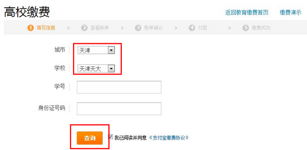 2、选择就读高校所在城市、学校名称,输入学生学号及身份证号;点击【查询】,即可显示应缴费用明细;待入学大一新生无学号,可输入通知书号。