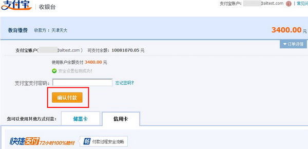 5、选择付款方式,支持支付宝余额、储蓄卡和信用卡支付,输入支付密码,点击【确认付款】,付款成功。