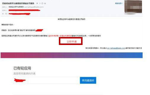 第四步、这时候,你就需要点击邮件的“立即开通”,并弹出的页面输入“邀请码”。如果你已有轻应用的话,可以直接在“已有轻应用”栏填入邀请码,再点击“使用“邀请码”。