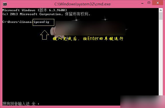 二、调出cmd命令框后,我们再输入命令: ipconfig 完成之后,按回车键运行,如下图所示: