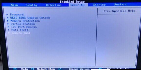 继续使用左右方向键切换到主菜单里的”Security“,接着找到这个界面的”Secure Boot“回车进入此设置,如下图: