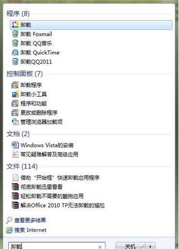 按下Win键激活“开始框”,在这里输入“卸载”或“Uninstall”(视应用程序的语言而定),或者两种方式组合使用,很快就可以列出已提供卸载选项的应用程序,如图1所示,选定之后即可启动卸载进程,这显然是快捷多了。当然,如果某个应用程序在安装时没有选择在开始菜单创建程序组,那么就只能通过“卸载或更改程序”来进行了,至于绿色程序的卸载这里就不需要多介绍了吧?