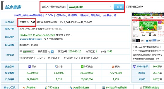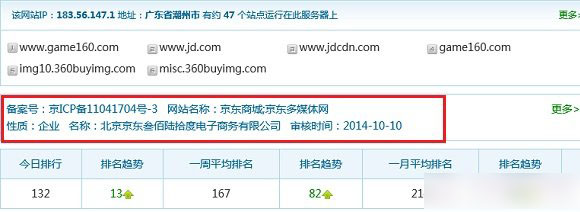 从上可以查出京东商城网站世界排名在400名以内,属于企业备案。一般排名一万以内的都是比较大型网站,另外加之是企业备案,因此基本可以断定不会是钓鱼网站。如果查询到的网站排名在十万以上以及备案信息是个人或者是无备案的,基本上该网站就不太靠谱,进入就需要小心了。
