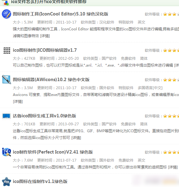 ico是Icon file的缩写,一般的大1点的软件都有个ICO文件就象网站的LOGO 一样,如果ico文件的分辨率过大,windows7 的图片管理器可以打开,也可以直接使用系统自带的缩略图来或者ACDSee预览ico文件,如果要编辑的话可以使用IconCool Editor等其他图标制作工具。