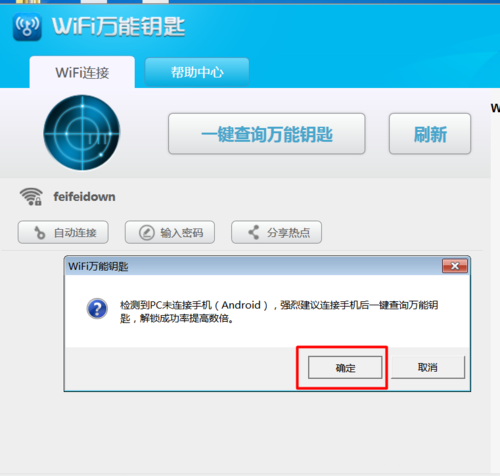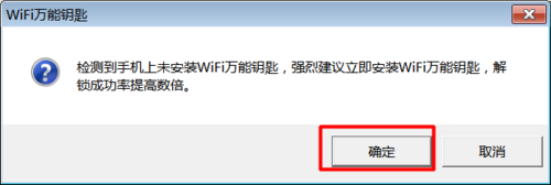 在破解过程中,如果弹出要求安装手机端客户程序提示时,按要求进行操作。将手机与电脑进行连接,然后再次点击“一键查询万能钥匙”按钮,同时给手机安装“wifi万能钥匙”。