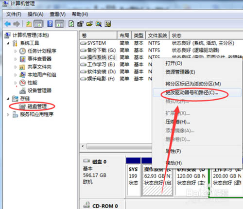 6、访问计算机管理,查看磁盘分区你会发现刚刚的G盘没有了。当然如果要查看的话,可以到磁盘管理里面再添加驱动号就好了