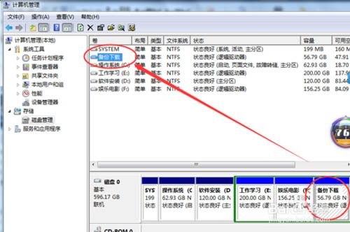 2、如图,进入【计算机管理-】---【磁盘管理】找到需要隐藏的磁盘分区,右键