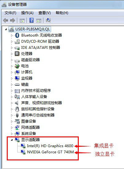 上图为笔者笔记本电脑,其中HD4600显卡是i7处理器的自带核心显卡,而GT 740M属于独立显卡。