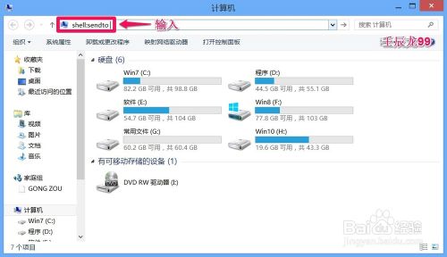 1、左键双击桌面计算机,在打开的计算机窗口的地址栏中输入:shell:sendto,按Enter键(回车),打开发送到菜单窗口;