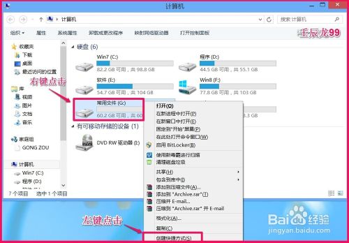 2、现在我们把本地磁盘常用文件(G)添加到发送到菜单里,具体操作方法是:打开桌面计算机,右键点击:常用文件(G),在右键菜单中左键点击:创建快捷方式(S);