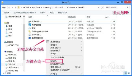 4、在第一步打开的SendTo窗口,右键点击空白处,在右键菜单中左键点击:粘贴;