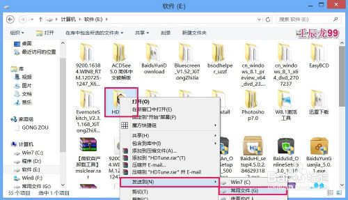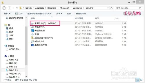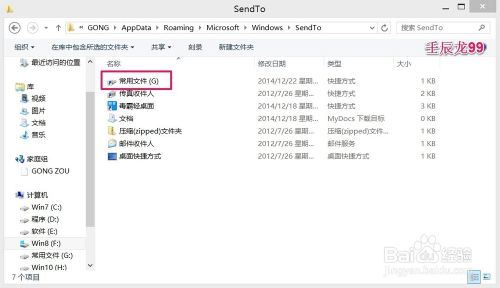 7、添加到发送到菜单中的二级菜单的应用:如果我们想把桌面的一些文件转移到常用文件(G)磁盘,只要右键点击该文件 - 发送到 - 常用文件(G)就行了,省去了打开(G)、右键、粘贴等步骤的操作;