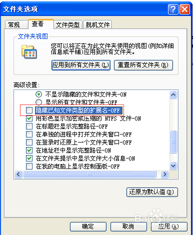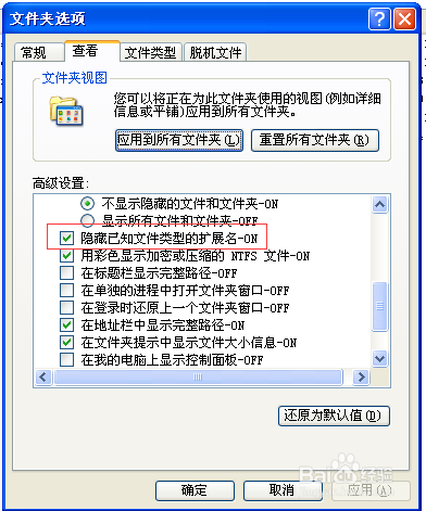 去除“隐藏已知文件类型的扩展名”前面的勾,点击“确定”按钮,回到文件夹。