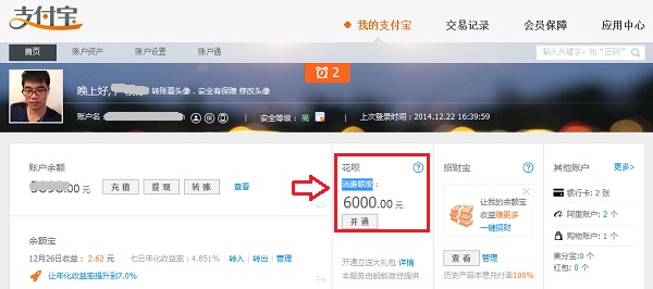 *注:如果您在电脑中登陆支付宝,没有看到花呗消费额度,则说明您暂时不在邀请范围,目前仅邀请部分用户体验花呗服务,请等待正式版推出后,再查看。