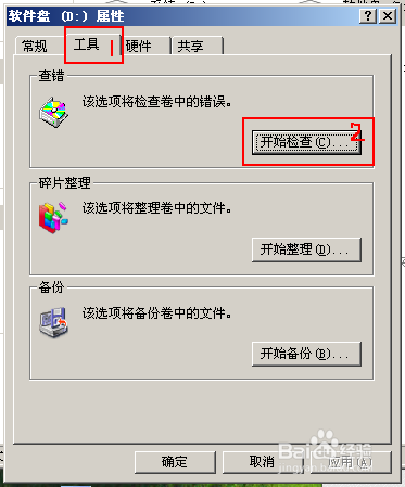 4、选择"工具",点击"查错"里的"开始检查"(也就是第一个"开始检查"),弹出检查磁盘的窗口(WIN7通用)