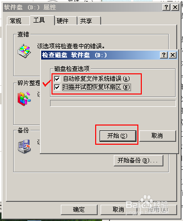 勾选"自动修复......错误"和"扫描并......扇区"(也就是全部都要打勾)