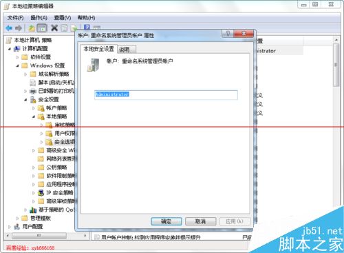6、点击“属性”后,就打开“账户:重命名系统管理员账户”属性对话框,如下图所示,在输入框中默认显示的就是当前的帐户名Administrator