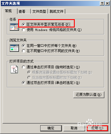 3、在弹出的文件夹选项对话框中点击“任务”中的“在文件夹中显示常见任务”前选中,然后点击下方的“应用”按钮。