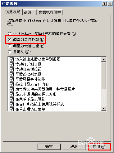 8、在弹出的“性能选项”对话框中点击选中视觉效果中的“调整为最佳外观”项,然后点击下方的“应用”按钮。