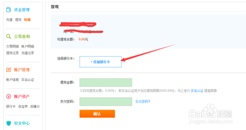 点击“提现”进入以后,会看到如图所示的框框,首先点击银行卡那一栏选择自己持有的并且能够正常使用的银行卡,添加