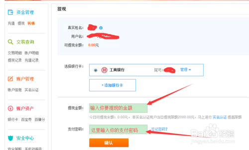 银行卡添加完成之后,就会自动返回提现界面,现在你看到的就是你自己添加好之后的界面,下面你只需要你要提现的金额,和你的支付密码。一般正常上班时间,提现到账的时间为1-2分钟,晚上的话是5-15分钟。根据各个银行到账时间不同,请大家耐心等待。
