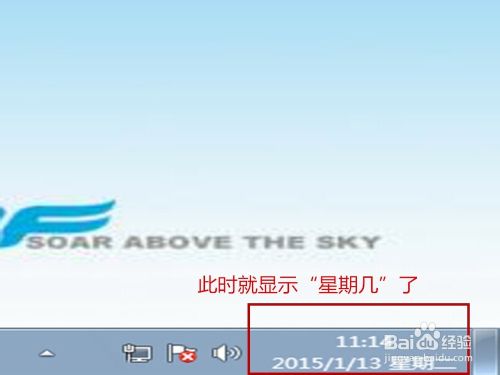 回到桌面看右下角就会发现在原来的年月日后面加了星期几。这样我们就完成了在时间处显示星期几的操作