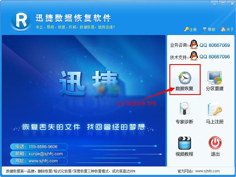 迅捷数据恢复软件是一款简洁易用的专业硬盘数据恢复软件,主要用于恢复被删除、被格式化、误Ghost丢失的文件等,并且支持恢复几百种文件格式,恢复内容非常全面。迅捷数据恢复软件操作过程十分简单,软件无需安装,双击即可使用,恢复率高达99%,是目前最好用的数据恢复软件!步骤1、打开迅捷数据恢复软件,单击“数据恢复”按钮进入下一步。
