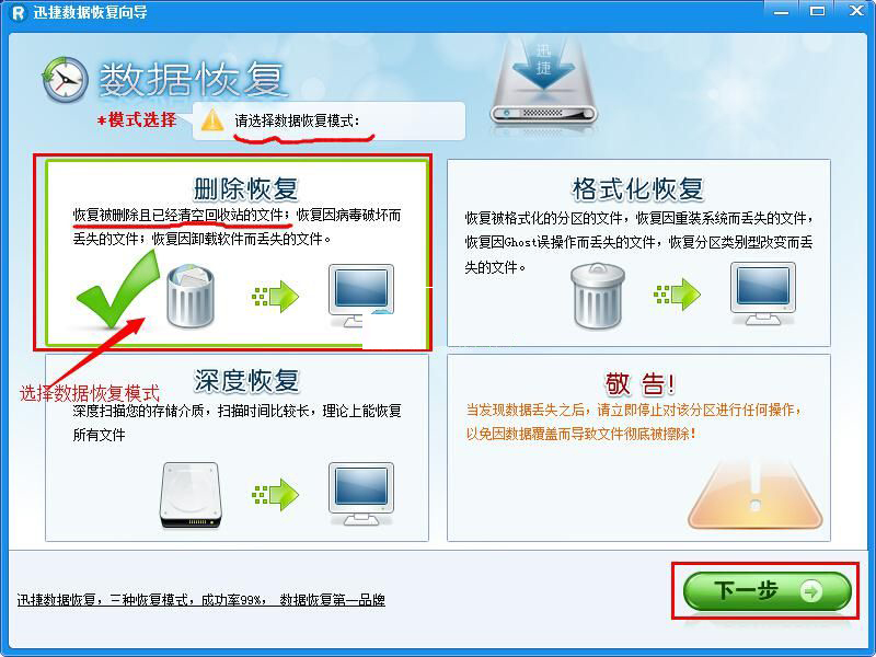 步骤2、单击选择数据恢复模式“删除恢复”,然后单击“下一步”。