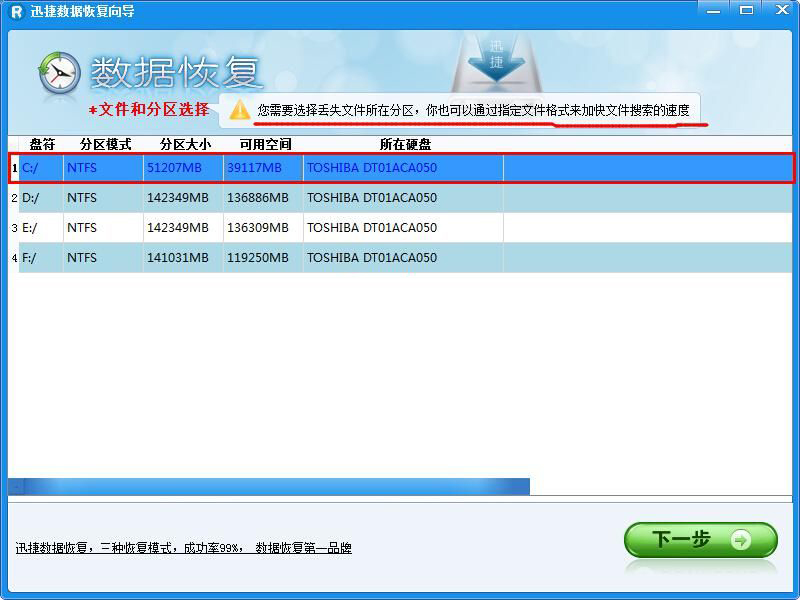 步骤3、选择丢失的文件所在的分区,如“C盘、D盘”(桌面文件丢失请选C盘),然后单击“下一步”进行扫描。
