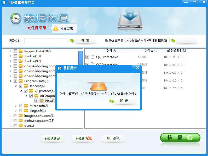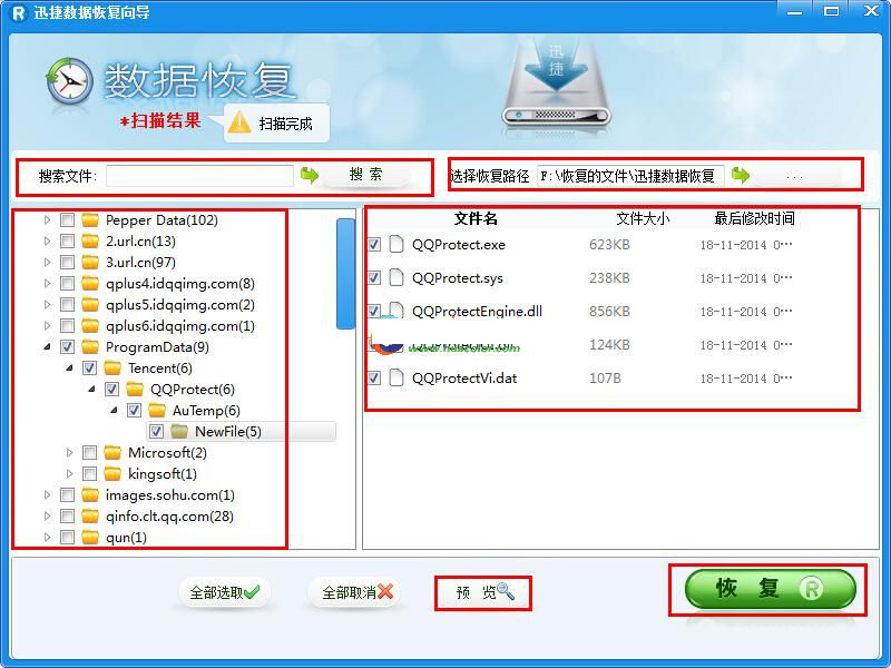 步骤5、扫描完毕,请在文件列表和文件夹中查找你所丢失的文件。被删除的文件有可能会被windows系统打乱目录,所以建议您使用“搜索文件”功能查找文件,以节省时间。