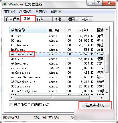 一、按下组合键 “ctrl + alt + esc ”打开任务管理器,然后选择进程选项卡。在进程中找到 explorer.exe 进程,然后按“结束进程”按钮,如下图所示: