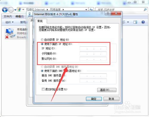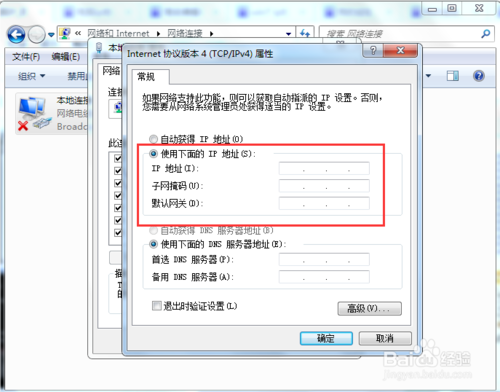 8、然后在打开的新窗口里,输入相关的IP地址信息,再单击【确定】按钮即可。
