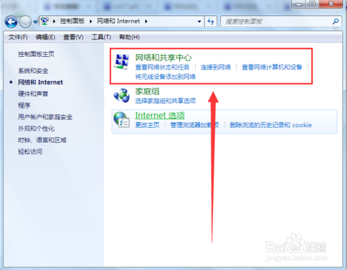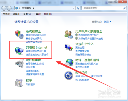2、后在【控制面板】窗口,单击【网络和Internet】选项,如下图所示。