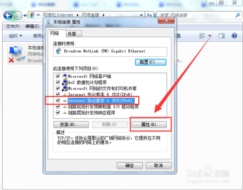 7、然后在弹出的窗口中,单击选择【Interner协议版本4】,再单击【属性】按钮。