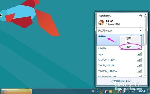 3、点击这个网络的图标后在新弹出的选项中找到你已经连接的无线网络,如下图所示我当前连接的网络名字为dalian,并且后面有已连接字样。