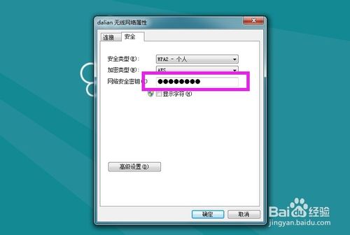 5、在打开的对话框中可以看到安全类型和加密类型,最后一个是网络安全密钥并且后面的输入框中都是小黑点(看下图)。