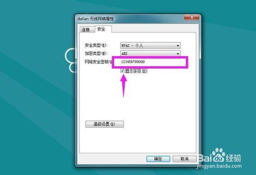 6、在输入框的下面有一个显示字符的复选框,勾选这个复选框就可以看到明文的密码了,这时你的其他设备就可以使用这个密码去链接这个wifi了。
