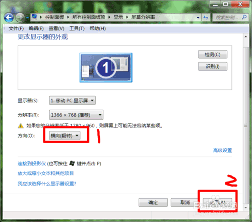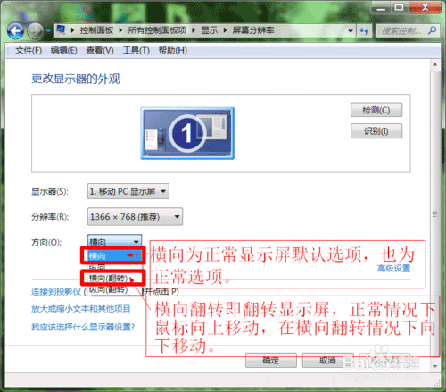 3、在显示——调整分辨率中方向一栏里有【横向】、【纵向】、【横向翻转】、【纵向翻转】几个选项。