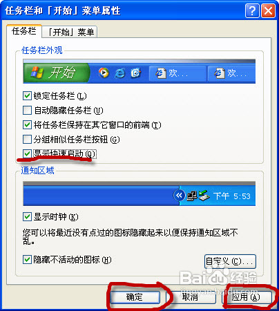 5、选中【显示快速启动】,点击【应用】,点击【确定】。