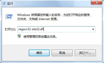 4、接着继续打开运行 输入 regsvr32 ole32.dll,然后点击确定,弹出一个提示框,表示成功