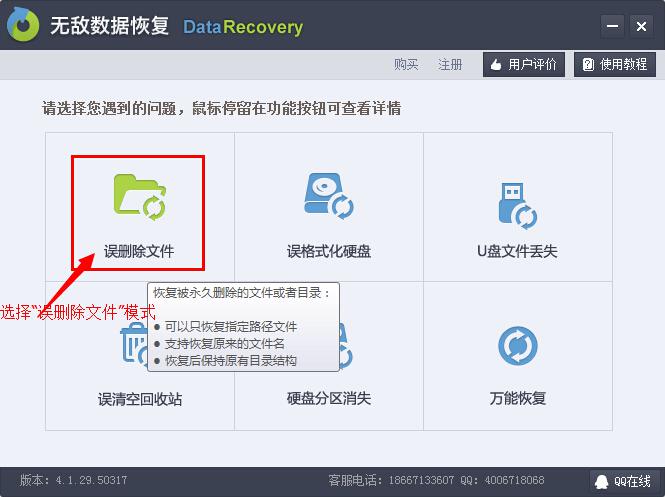 第一步:打开电脑中安装好的无敌数据恢复软件,单击“误删除文件”恢复模式。
