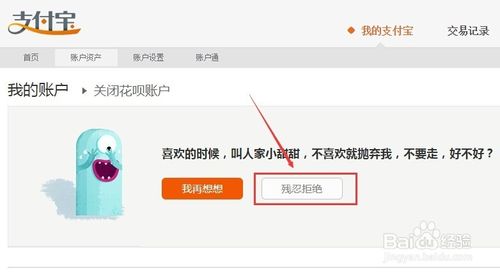 点击关闭花呗后,跳转到花呗账户关闭页面,在这个页面上可以看到搞笑的提示,然后我们直接点击残忍拒绝,如下图所示。